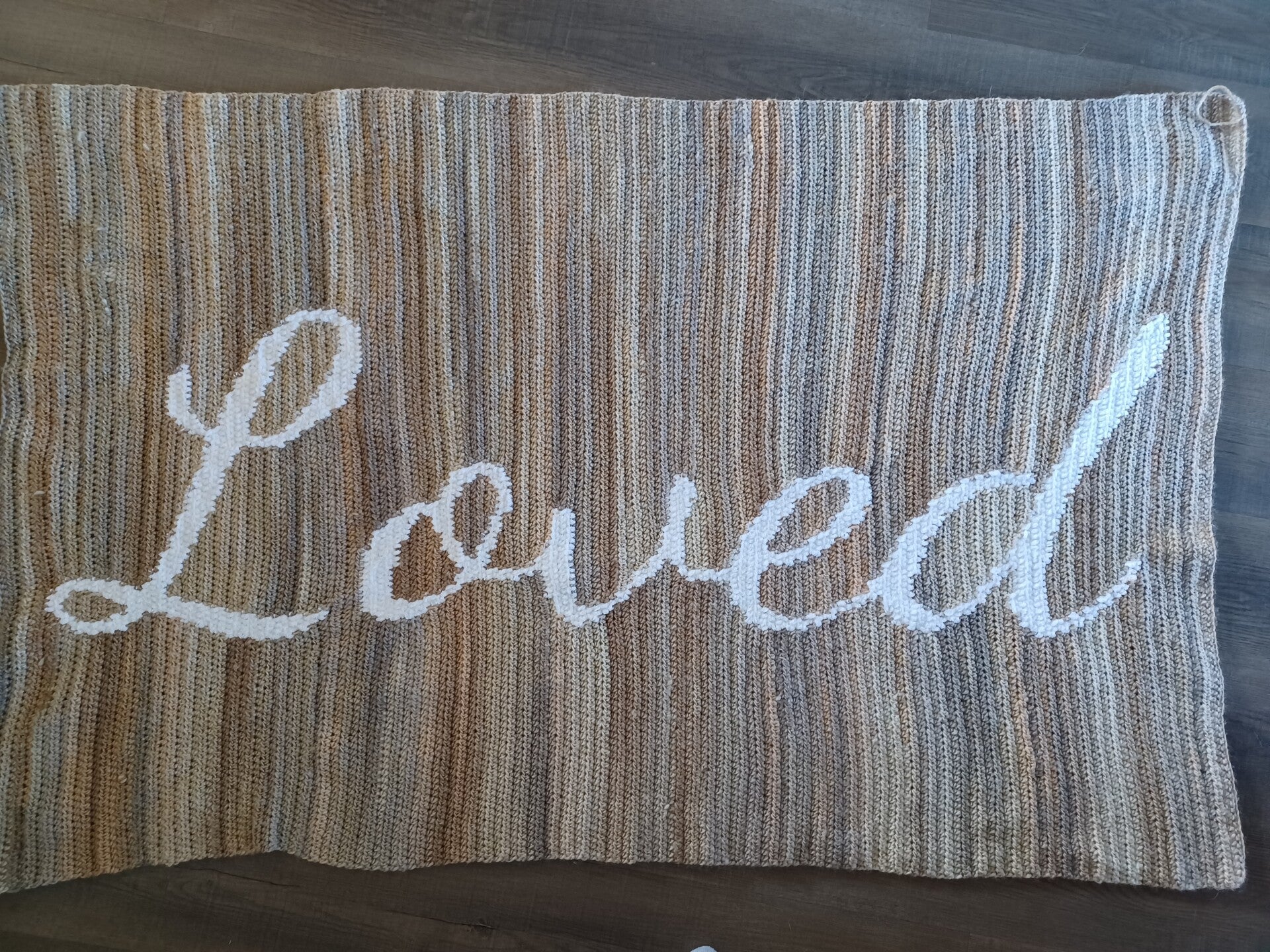 This blanket is 63" X 38". It is made from Caron Macchiato cakes in the color whisper as the base. The words are Barnet Velvet white. The machine was cold and lay flat to dry.
