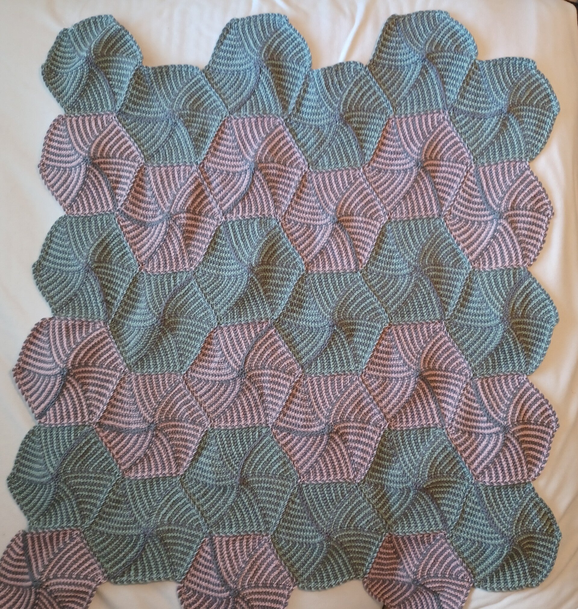 I found the swirl pattern somewhere and decided to connect them to make a blanket. This is done with Tunisian simple stitch.